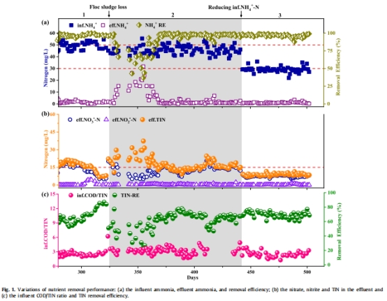 Phase III:降低進水氨氮(46.1→29.0 mg N/L),驗證低氮負荷下的脫氮性能(圖1a)。