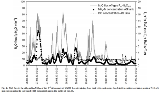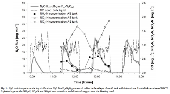 硝化是N?O主要來(lái)源:好氧階段N?O排放與進(jìn)水氨氮(NH??)負(fù)荷峰值正相關(guān)(圖1-2),尤其在NH??濃度升高時(shí)排放激增。