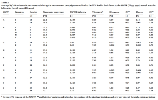 脫氮效率與排放負(fù)相關(guān):TN去除率≥83%的廠(如B、C、G廠)N?O排放強(qiáng)度最低(0.0012±0.001 kg N?O-N/kg TKN),而低脫氮率廠(如D、J廠)排放因子高達(dá)1.52%(表2)。