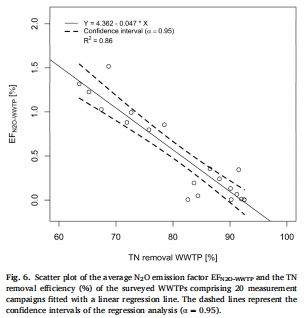 多元線性回歸:關(guān)聯(lián)EF<sub>N?O-WWTP</sub>與TN去除率、進(jìn)水TN/COD比、水溫等參數(shù)(R軟件平臺(tái))。