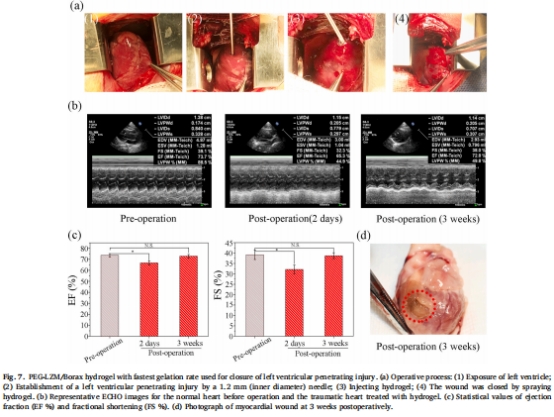數據:硼砂水凝膠3秒封閉兔心室傷口(直徑1.2 mm),術后3周心功能(EF%和FS%)完全恢復(圖7b-c)。