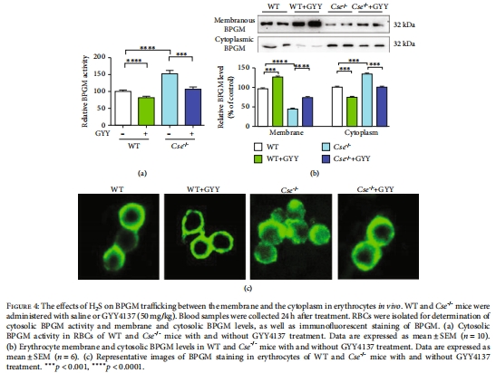 分子機制:H?S通過促進Hb從膜釋放至胞質,增強BPGM膜錨定(圖4-6),該過程與Hb的S-硫磺化修飾(Cys104位點)相關(圖7)。