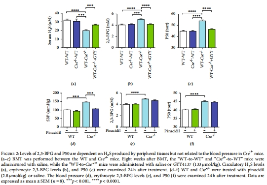 H?S缺失導致2,3-BPG升高:胱硫醚-γ-裂解酶(CSE)基因敲除(Cse?/?)小鼠紅細胞中2,3-BPG水平顯著增加,50%氧飽和度(P50)值升高(圖1a-c)。