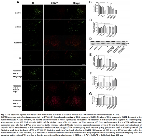 神經元保護:HS增加延髓頭端腹外側區(RVLM)兒茶酚胺能神經元和黑質(SN)多巴胺能神經元存活數量(圖2B、3B),降低α-突觸核蛋白(α-Syn)積累(圖2C、3C)和活性氧(ROS)水平(圖2G、3G)。