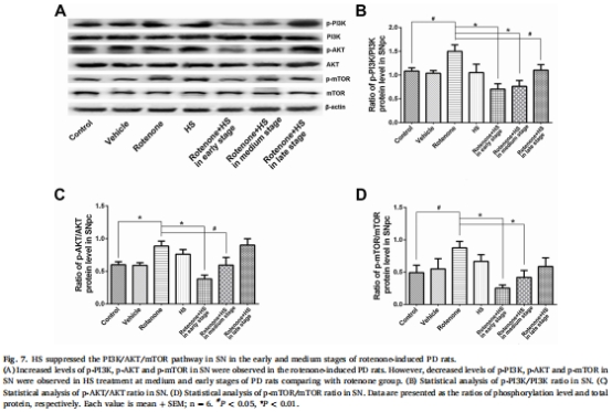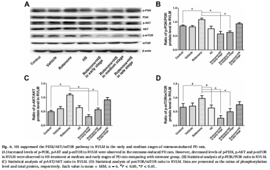 探究HS對PD不同階段(早期、中期、晚期)的神經保護效果,闡明其通過調節自噬通路(PI3K/AKT/mTOR)降低氧化應激和α-Syn毒性的分子機制。