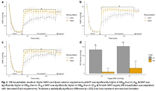 血壓維持:WB組更有效維持目標(biāo)平均動脈壓(MAP)(WB??組:68.7 mmHg vs. LR??組:53.5 mmHg;WB??組:72.5 mmHg vs. LR??組:59.8 mmHg;均 p<0.001)(圖2a-c)。