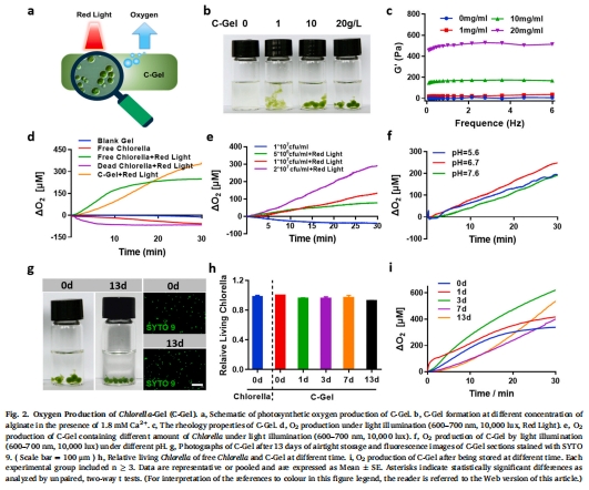 C-Gel:海藻酸鈉包裹小球藻形成凝膠(圖2a),保護(hù)小球藻活性并提升產(chǎn)氧效率(圖2d,i);
