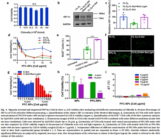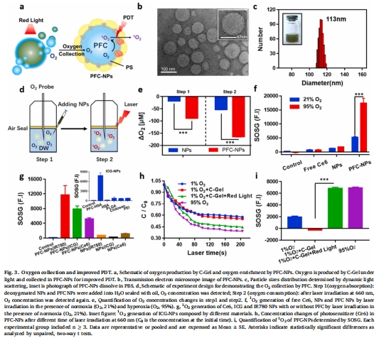 PFC納米顆粒(PFC-NPs)作為氧收集器,將氧富集于光敏劑周圍,提升單線態(tài)氧(1O?)產(chǎn)量(圖3f)。