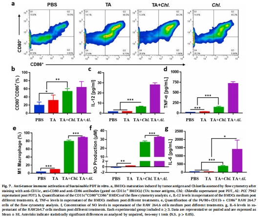免疫激活:PDT處理的小球藻上清液促進(jìn)DC成熟(CD80/CD86↑)及炎癥因子分泌(IL-12/TNF-α↑)(圖7)。
