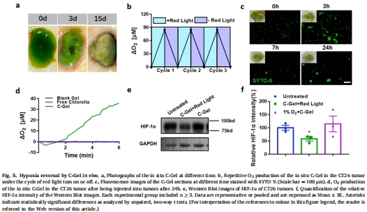 小球藻凝膠(C-Gel)在紅光(600–700 nm)照射下持續(xù)產(chǎn)氧,逆轉(zhuǎn)腫瘤缺氧(圖2d,e);