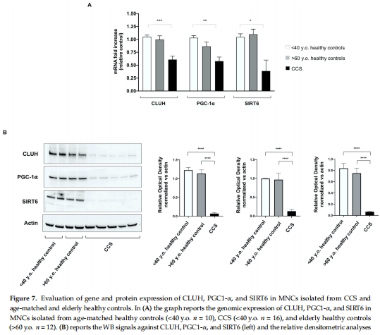 CLUH, PGC1-α, SIRT6 基因和蛋白表達(dá)在CCS中顯著下調(diào)(圖7A-B),而健康老年人無(wú)此現(xiàn)象。