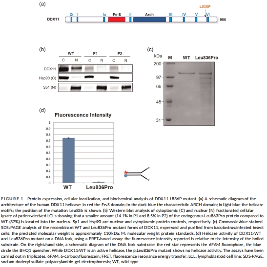 華沙斷裂綜合征(WABS)由 DDX11基因 雙等位基因突變引起,該基因編碼一種依賴ATP的DNA解旋酶。本研究通過分析攜帶 p.Leu836Pro 錯義突變和 p.Lys303Glufs22* 移碼突變的WABS患者細胞,發現: