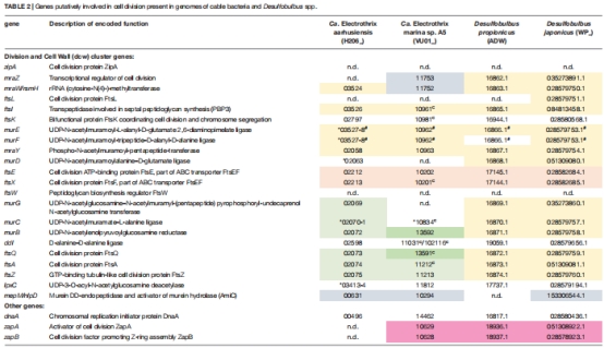 基因組尺度:比對電纜細菌與近緣菌(Desulfobulbus)的細胞分裂基因簇(表2)。
