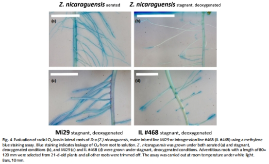 ROL屏障的誘導性:在缺氧停滯條件下,野生種和滲入系的側根基部形成強效ROL屏障,而栽培玉米(Mi29)無此能力(圖2,4)。