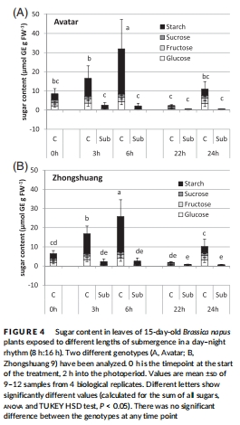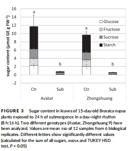光周期下淹水植株無法積累糖類(對照植株白天糖積累)。