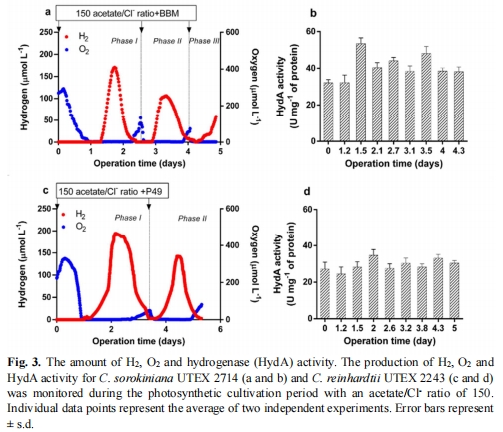 機制創新:乙酸鹽/Cl?比例 >150 時,乙酸鹽競爭性抑制PSII放氧(圖1),激活氫酶產氫(圖3)。