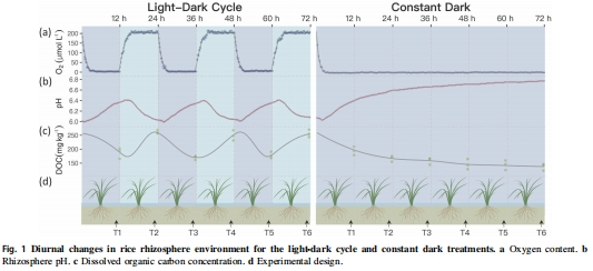 本研究通過丹麥Unisense微電極技術結合16S cDNA測序,首次揭示光照通過兩種機制調控水稻根際微生物晝夜節律: