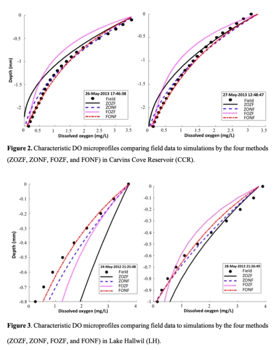 研究通過改進沉積物氧動力學模型,引入負通量下邊界條件(-0.25 g O? m?2 d?1)模擬還原性物質(如甲烷、銨鹽)上涌對氧消耗的影響。基于美國卡文斯灣水庫(CCR)和瑞士哈爾維爾湖(LH)的原位溶解氧(DO)微剖面數據,對比零階/一階動力學模型在零通量(ZOZF/FOZF)與負通量(ZONF/FONF)邊界條件下的擬合效果。結果表明: