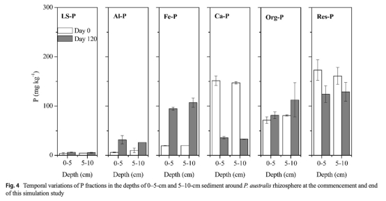 1. 磷形態(tài)動(dòng)態(tài)轉(zhuǎn)化:蘆葦生長(zhǎng)促使沉積物中鈣結(jié)合態(tài)磷(Ca-P)減少77%,鐵吸附態(tài)磷(Fe-P)增加400%,磷形態(tài)由惰性向氧化還原敏感態(tài)轉(zhuǎn)化(圖4)。