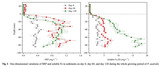 2. 孔隙水磷活性增強(qiáng):蘆葦根際區(qū)可溶性活性磷(SRP)濃度提升3倍,擴(kuò)散通量增加17倍(圖5,7),并形成與根系形態(tài)匹配的斑塊狀活性磷分布(圖6)。