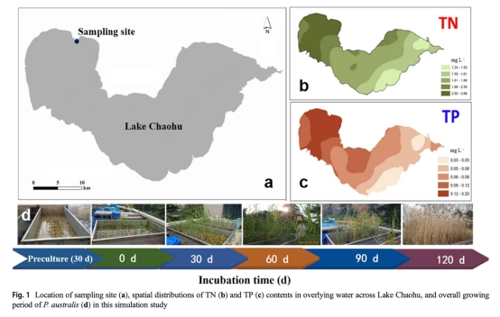 1. 原位模擬設(shè)計(jì):采集巢湖沉積物與上覆水,構(gòu)建沉積物-蘆葦微宇宙系統(tǒng)(圖1d),模擬120天生長(zhǎng)期(萌芽至衰老)。