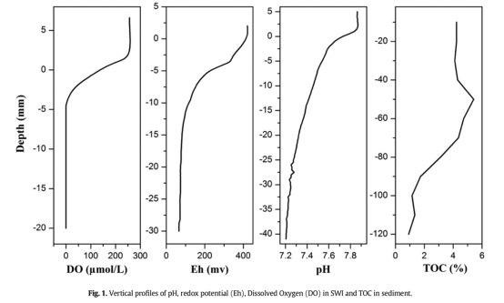 ? 數據:DO從覆水層250 μmol/L降至沉積物4.6 mm處缺氧;Eh從421 mV降至65 mV;pH由7.9降至7.2;TOC平均3.31%。