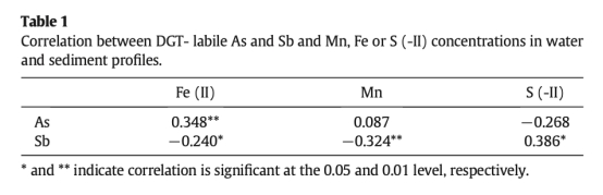 ? 數據:DGT-As與Fe正相關(r=0.348),Sb與Fe/Mn負相關(r=-0.24/-0.324)。
