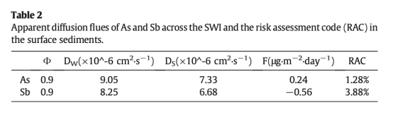 3. 風險評估:As凈擴散通量為正值(0.24 μg·m?2·d?1),存在上覆水污染風險;Sb為負值(-0.56 μg·m?2·d?1),沉積物表現(xiàn)為匯。