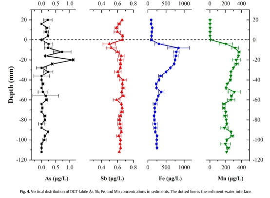 ? 數據:溶解態(tài)As在-95 mm處出現(xiàn)異常峰值(19.88 μg/L),其余區(qū)域穩(wěn)定(2.94-7.36 μg/L);DGT活性態(tài)As在-20 mm處達峰值0.80 μg/L,Sb穩(wěn)定(0.50-0.67 μg/L)。