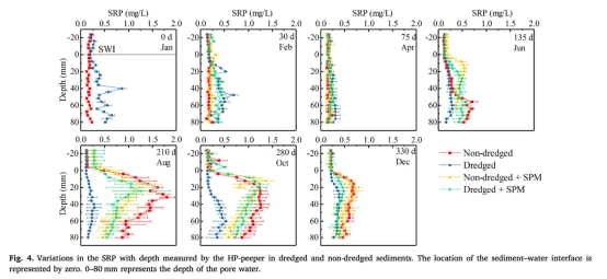 ? 孔隙水磷動態(tài):高分辨率滲析(HR-Peeper測SRP,圖4)、薄膜梯度擴(kuò)散(DGT測活性磷,圖5)、磷再補(bǔ)給能力(R= DGT-P/SRP,圖6)。
