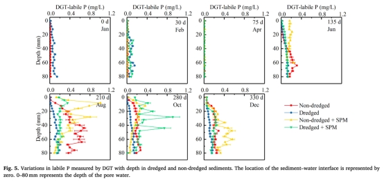 ? 高分辨率剖面(圖2)顯示疏浚(D組)使SWI溶解氧(4.59-8.89 mg/L)顯著高于未疏浚組(ND組3.14-7.82 mg/L),氧滲透深度(OPD)增加,直接驗證疏浚通過移除有機(jī)質(zhì)減少耗氧,創(chuàng)造抑制磷釋放的氧化環(huán)境。