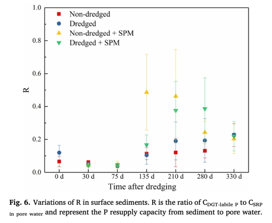 2. SPM的負(fù)面影響:外部輸入的SPM富含有機(jī)質(zhì)(OM平均8.81% vs 沉積物6.69%)和活性磷(Fe-P↑67%),其沉積加速了疏浚后沉積物磷活性恢復(fù),通過消耗DO(降至0.61-5.38 mg/L)和提高磷再補(bǔ)給能力(R值↑),增加內(nèi)源磷釋放風(fēng)險。