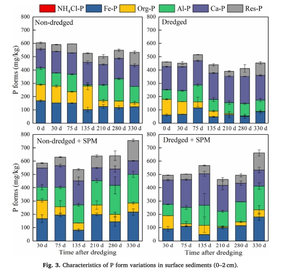 ? 意義:疏浚(D組)使活性磷(NH?Cl-P+Fe-P+Org-P)占比↓,惰性磷(Ca-P+Res-P)占比↑至61.8%;SPM輸入(DS組)逆轉(zhuǎn)該趨勢,330天后磷形態(tài)恢復(fù)至未疏浚狀態(tài)。