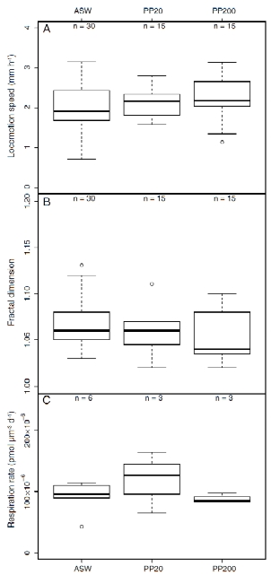運(yùn)動速度(圖2A):范圍0.7–3.2 mm/h(ASW)、1.6–2.8 mm/h(PP20)、1.1–3.1 mm/h(PP200)。