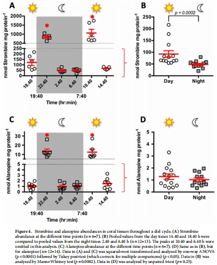 1. 海藻氨酸(Strombine) 是珊瑚主要發酵終產物(圖3-4),其濃度晝夜波動顯著(20-1744 nmol/mg蛋白);