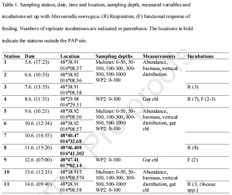 在PAP站位(東北大西洋)10天內(nèi)進(jìn)行8次采樣,對(duì)比不同水文條件下橈足類響應(yīng)(表1)。