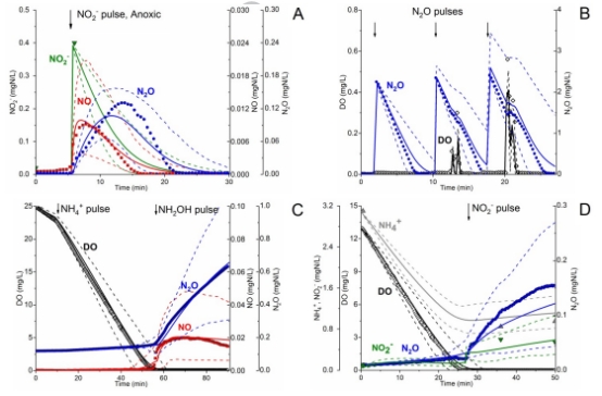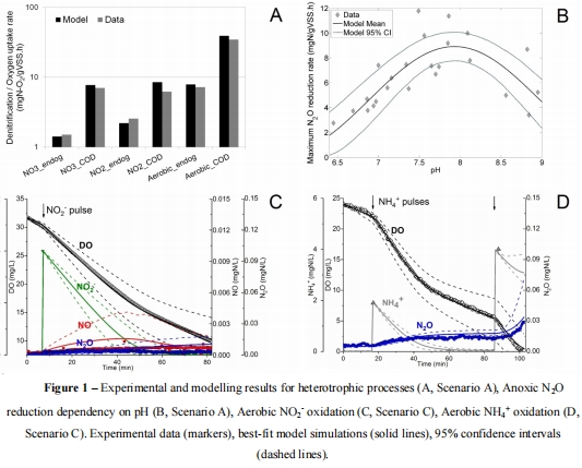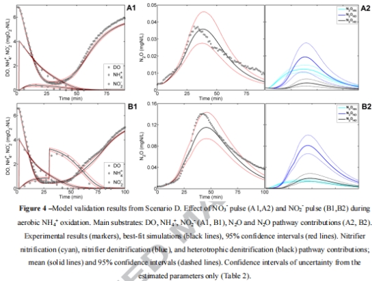 本研究開發(fā)了NDHA模型(描述三種生物N?O產(chǎn)生途徑),通過呼吸測量實(shí)驗(yàn)校準(zhǔn)了活性污泥混合培養(yǎng)物的N?O動(dòng)態(tài)。關(guān)鍵突破包括: