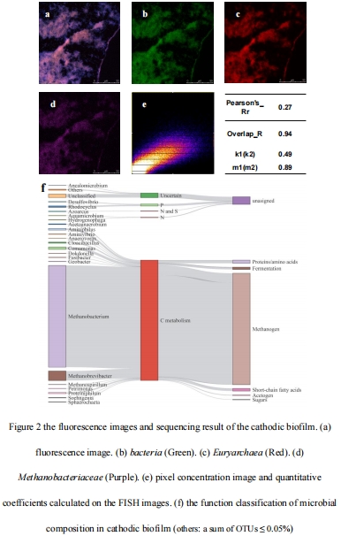 FISH顯示古菌(紅色)與細菌(綠色)共定位(Pearson R=0.78),Methanobacteriaceae占比87.12%;