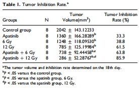 聯(lián)合組(阿帕替尼+12 Gy)腫瘤體積最小(286 mm3),抑制率85.9%(表1)。