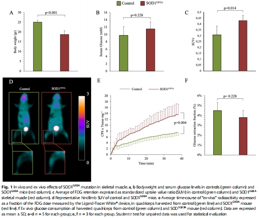 SOD1G93A小鼠骨骼肌FDG攝取升高40%(SUVr: 0.43 vs. 0.31,圖1c),但 葡萄糖消耗未增加(圖1f)。