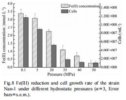 耐壓性:在0.1–50 MPa靜水壓力下持續(xù)還原Fe(III),以葡萄糖或丙酮酸為碳源(圖8-9)。