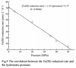 壓力:0.1–50 MPa下持續(xù)還原,F(xiàn)e(II)積累率隨壓力升高而降低(70.8 → 5.3 μmol/L/h),53 MPa時(shí)停止(圖8-9)。