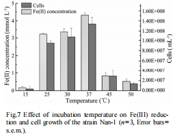 還原與生長(zhǎng)同步:Fe(II)積累峰(4.33 mmol/L)與生物量峰值(1.34 × 10^8 cells/mL)均出現(xiàn)在37℃(圖5,7)。