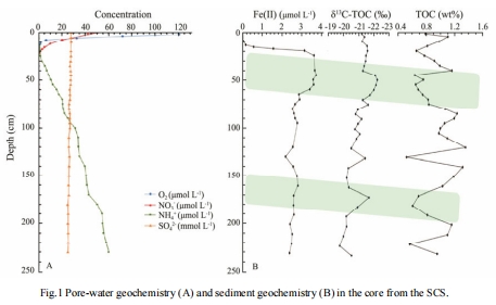 Fe(II)峰值(2.33 μmol/L)位于25–230 cm,與低TOC、低δ13C區(qū)間對(duì)應(yīng)(圖1B)。