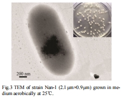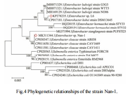 純化菌株Nan-1,通過 TEM形態(tài)觀察(圖3)、16S rRNA基因測(cè)序(圖4)和系統(tǒng)發(fā)育樹分析鑒定為 Enterobacter hormaechei亞種(相似度99%)。