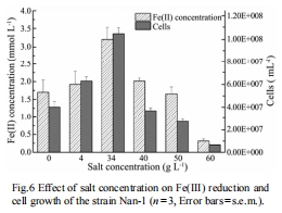 鹽度:0–60 g/L下均可還原Fe(III),最適34 g/L(圖6)。
