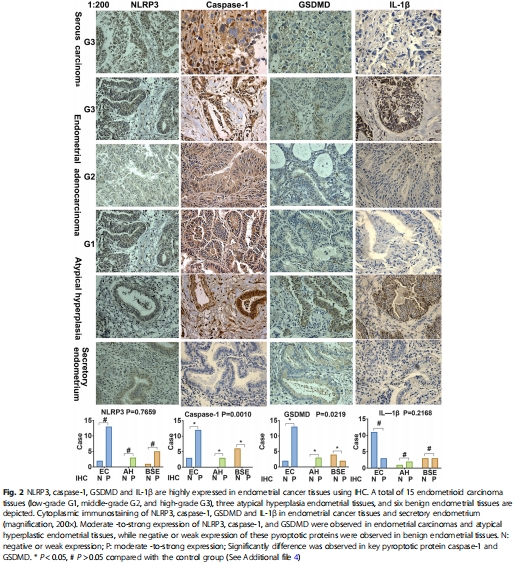 免疫組化(IHC)檢測人子宮內膜癌組織中NLRP3、caspase-1、GSDMD表達(圖2)。
