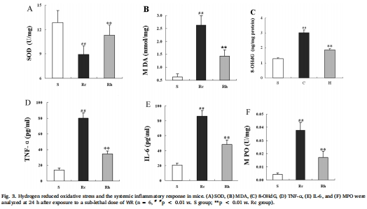 體內(nèi)效果:富氫鹽水(Hs)提高輻射小鼠生存率(圖1B),改善體重和攝食量(圖1C-D),減輕腸黏膜損傷(圖2A),降低炎癥因子(TNF-α、IL-6)和氧化應(yīng)激標志物(MDA、8-OHdG)(圖3)。