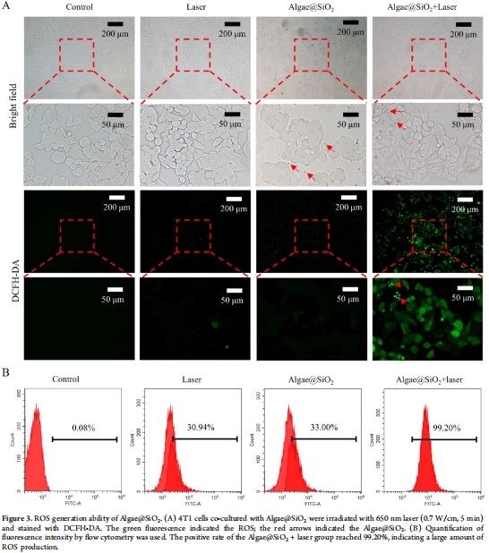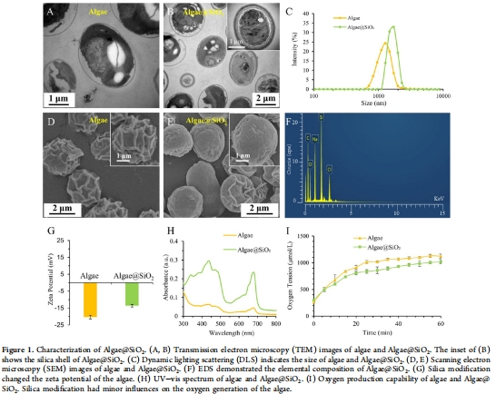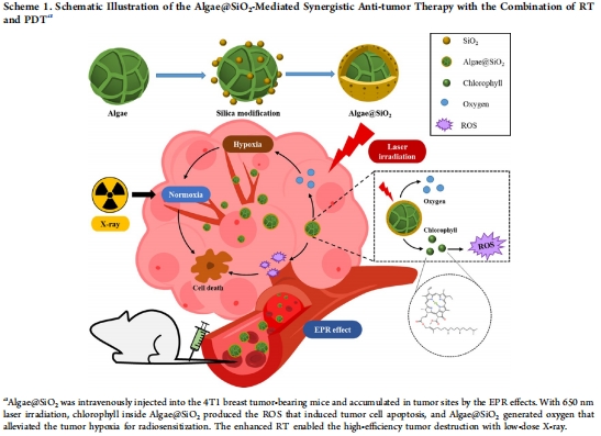 功能設(shè)計:Algae@SiO?通過光合作用在激光照射下原位產(chǎn)氧,緩解腫瘤缺氧并增強放療敏感性;其內(nèi)源葉綠素可產(chǎn)生ROS實現(xiàn)級聯(lián)光動力治療(Scheme 1)。