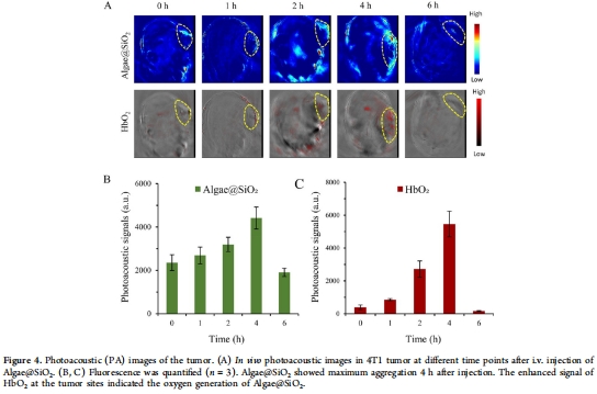 多模態(tài)成像:葉綠素賦予Algae@SiO?光聲(PA)和熒光(FI)雙模成像能力,實現(xiàn)腫瘤靶向監(jiān)測(圖4)。
